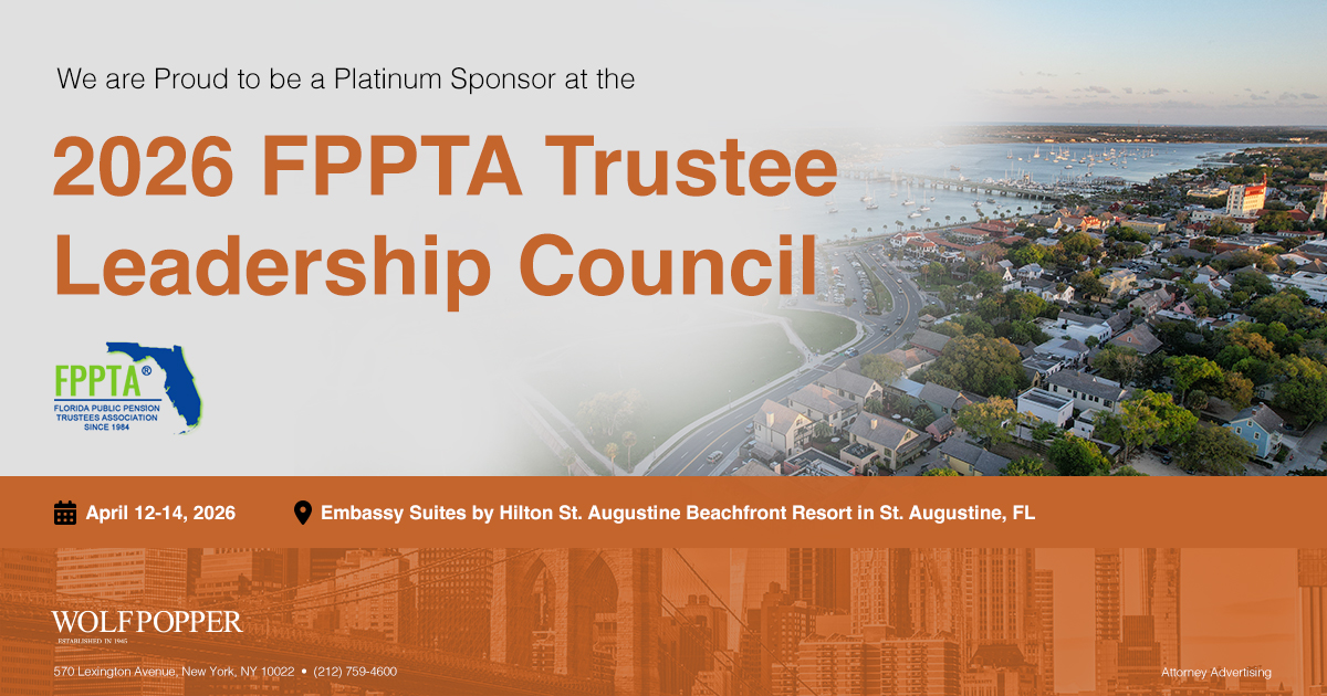 Wolf Popper is Proud to be a Platinum Sponsor at the 2026 Florida Public Pension Trustees Association Trustee Leadership Council taking place April 12-14, 2026 at the Embassy Suites by Hilton St. Augustine Beachfront Resort in St. Augustine, FL.