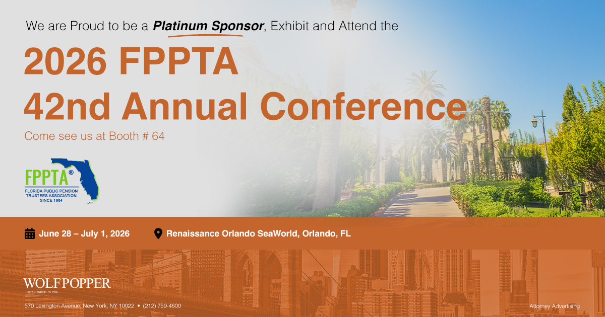 Wolf Popper is proud to be a Platinum Sponsor, exhibit, and attend the 2026 Florida Public Pension Trustees Association (FPPTA) 42nd Annual Conference taking place from June 28 - July 1, 2026 at the Renaissance Orlando Sea World in Orlando, FL.