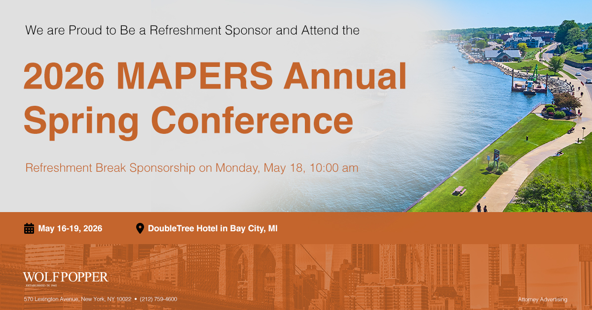 Wolf Popper is Proud to be a Refreshment Sponsor and Attend the Michigan Association of Public Employee Retirement Systems (MAPERS) 2026 Spring Conference taking place May 16-19, 2026 at the DoubleTree Hotel in Bay City, MI.
