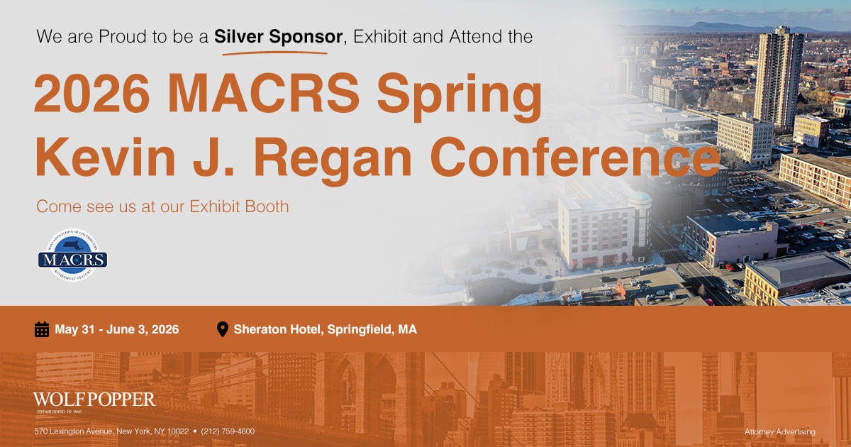 Wolf Popper is Proud to be a Silver Sponsor, Exhibit, and Attend the Massachusetts Association for Contributory Retirement Systems (MACRS) 2026 Spring Kevin J. Regan Conference taking place May 31, Sheraton Hotel in Springfield, MA.