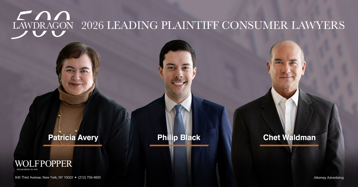 Wolf Popper is proud to announce that partners Patricia Avery, Philip Black, and Chet Waldman have been named to the 2026 Lawdragon 500 Leading Plaintiff Consumer Lawyers list for their work in consumer protection and healthcare litigation. This marks another year of recognition for their dedication to advocating for individuals and families facing complex legal challenges.