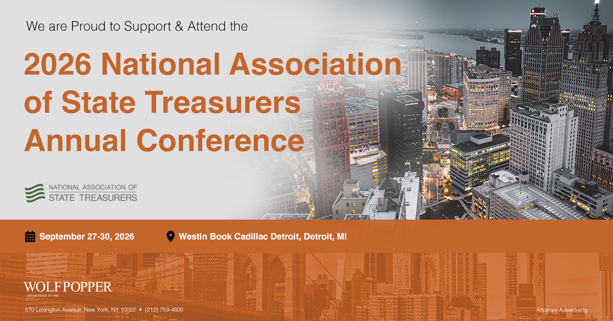 Wolf Popper Proudly Supports and Attends the 2025 National Association of State Treasurers Annual Conference taking place September 27-30, 2026 at the Westin Book Cadillac Detroit in Detroit, MI.